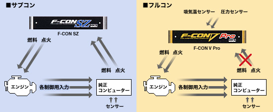 | よくコンピュータチューニングにおいて、フルコンとかサブコンと言いますが何が違うのか 端的に言えばサブコンはライトチューニング向けのもので、純正コンピュータ制御に補正を加える方式をとっています。取扱が比較的簡単であり、セッティングも楽です。 それに対しフルコンはハードチューニング向けで、純正コンピュータ制御に補正を加える方式ではなくダイレクトに制御する方式をとっています。エアフロレス・多連スロットル・ダイレクトイグニションへの変更等に対応しておりより高度で幅広いチューニングに対応しています。 |